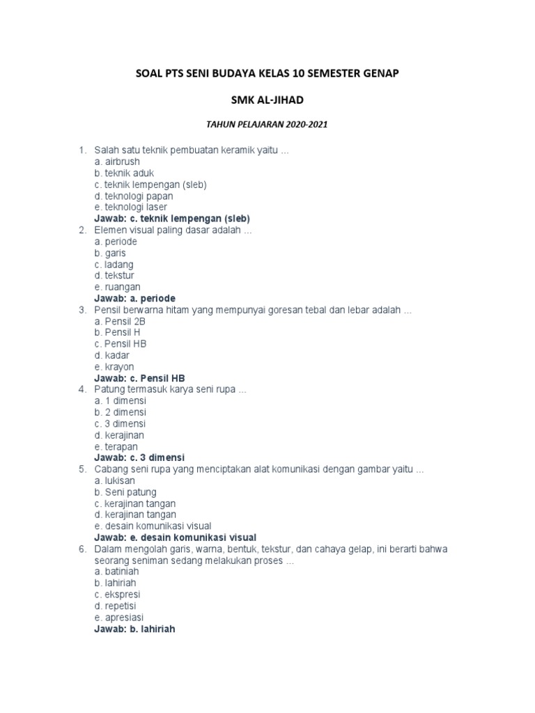 Soal Jawaban Pts Uts Seni Budaya Kelas 10 Semester 2 Kherysuryawan Id